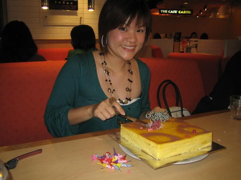 sharon is the organiser but she got hospitalised as the doc give her wrong medicine.. stupid doc.. so zhiqiang become our co-organiser.. haha.. we meet at 7 at raffles city.. we decide to go cartel for diner.. meifang is the one who bought the cake.. mi, meifang, zhiqiang n chuang neng meet at 7.. jinwei meet us at 7.30.. n karin (the bdae gal) meet us ard 7.45.. when they all reached, we ordered diner.. mi n meifang shared one pork ribs.. haha..